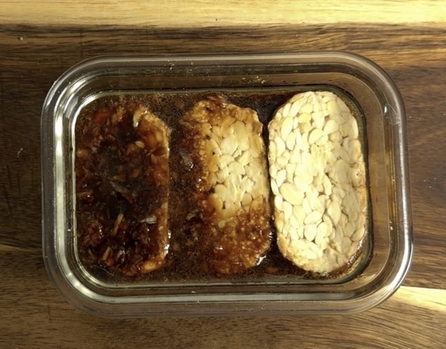 Cut the tempeh into even slices and dunk them into the marinade. Secure the lid on the container and shake gently to coat all pieces evenly. Place the container in the fridge and allow the tempeh to marinate for 40 minutes.
