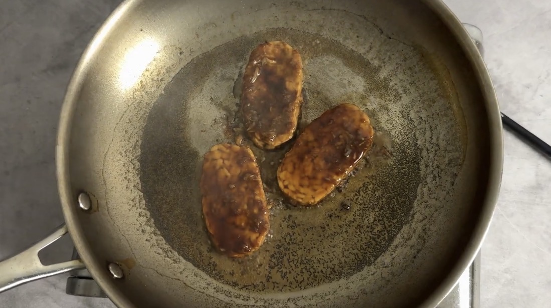 Once the tempeh has finished marinating, heat a pan with some olive oil and fry the tempeh slices until they develop a crispy, dark brown exterior on both sides.