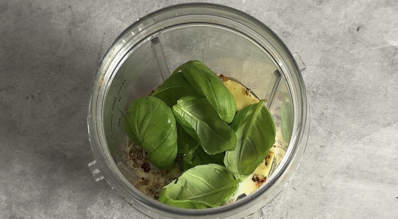 Transfer to a blender cup: 41 g sun-dried tomato sauce, 2 tbsp nutritional yeast, the cooked tempeh, sage, crushed chillies, cajun seasoning, soy milk, 14 g olive oil, 15 g sugar, and a few fresh basil leaves. Blend until creamy and smooth.