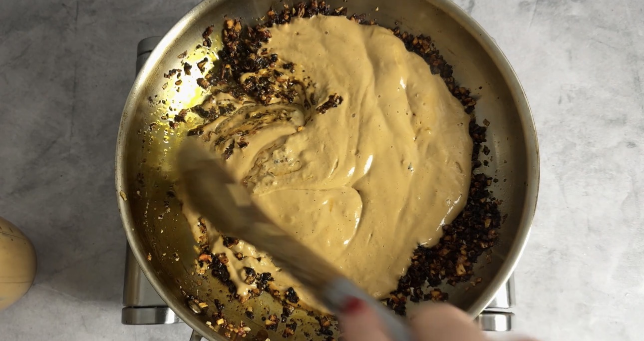 Dark, smoky flavour: Frying the tempeh and later the garlic–onion mixture until deep golden and slightly dark is intentional. This adds a subtle smokiness that balances the tangy sun-dried tomato sauce.