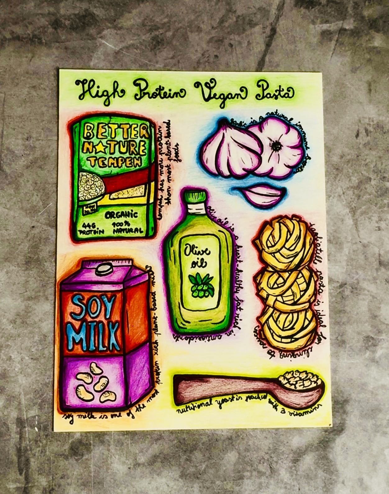 Before we dive into the recipe, I wanted to share this little sketch I made. After cooking the recipe, I went back and illustrated the ingredients that carried it. Protein-rich tempeh, soy milk for creaminess, olive oil, garlic, and pasta. Each element earned its place in the dish, and that’s what this drawing captures. You can find my art on Etsy at https://tinygreenfork.etsy.com/uk/listing/4443376727/high-protein-vegan-pasta-ingredients-art